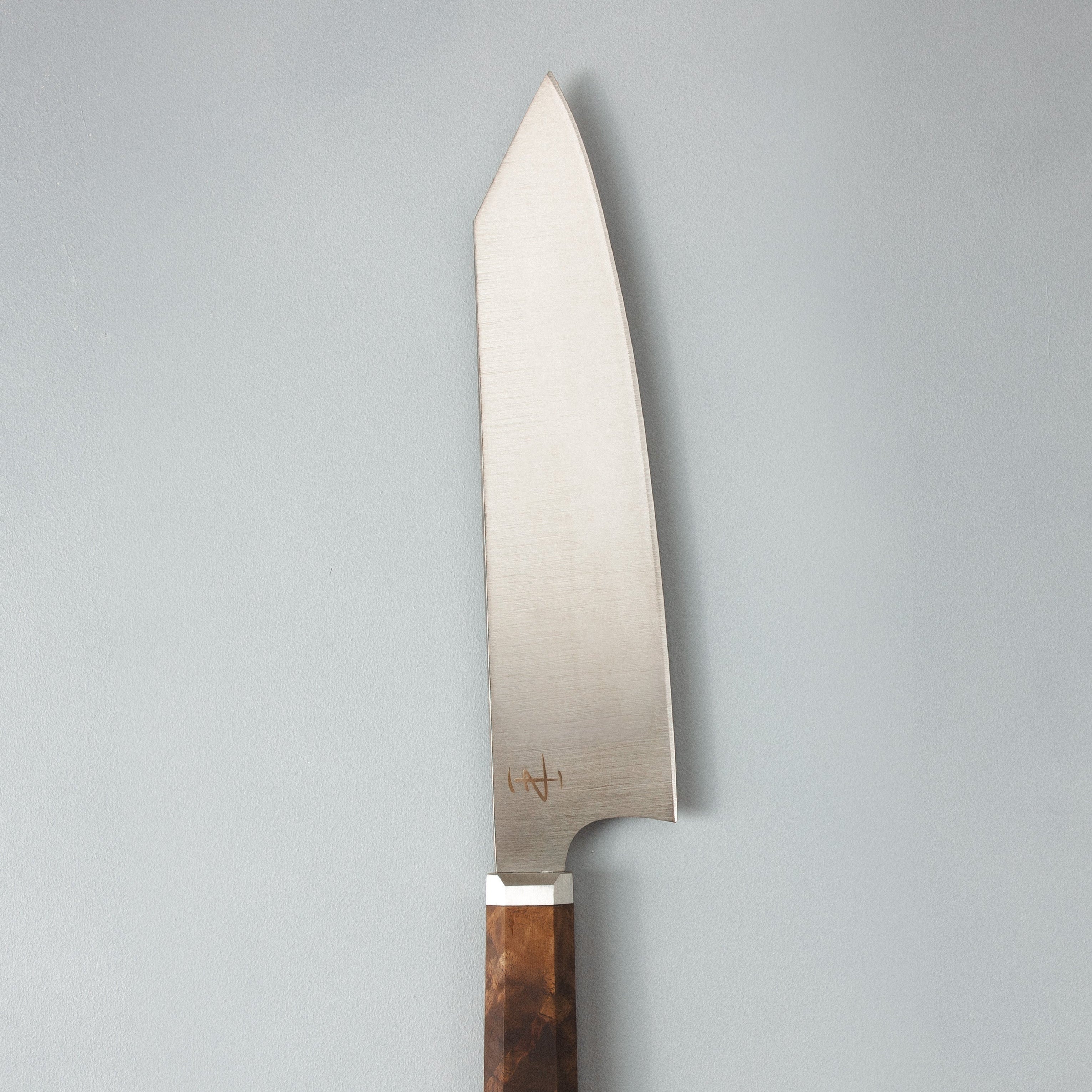 Kiritsuke, çok yönlü kullanım imkanı sunan bir şef bıçağıdır. 21 cm uzunluğundaki namlusu, 2.5 mm sırt kalınlığı ve 48 mm genişliği ile hassas ve kontrollü kesimler yapmanızı sağlar. N690 çeliğinden üretilen bu bıçak, 58 HRC sertlikte olup uzun süre keskin kalır. Sekizgen formdaki amerikan ceviz ağacı sapı ve paslanmaz balçağı, ergonomik bir tutuş ve zarif bir görünüm sunar.